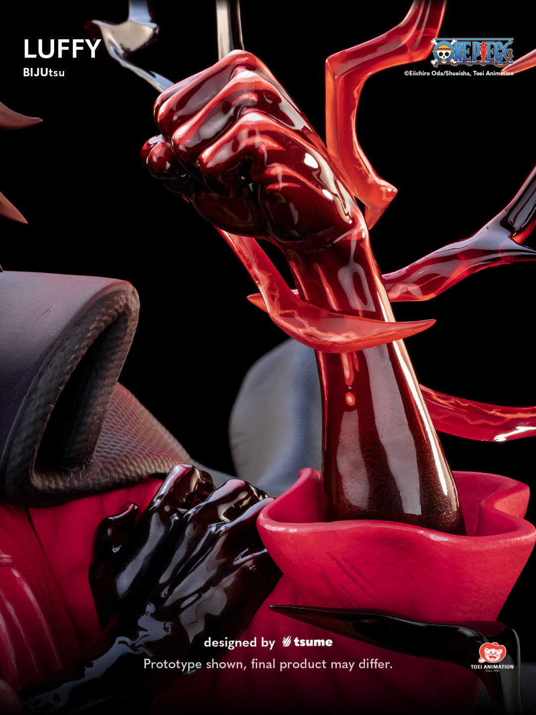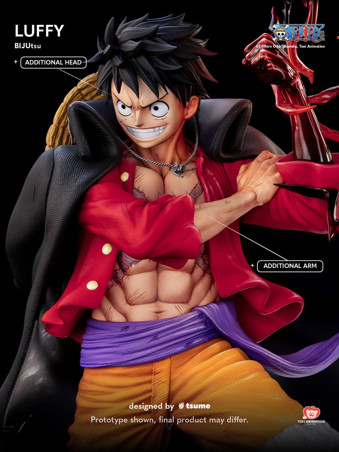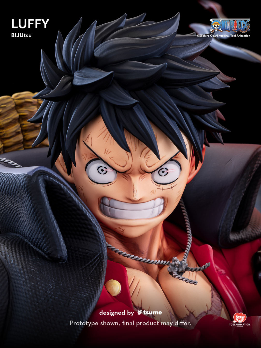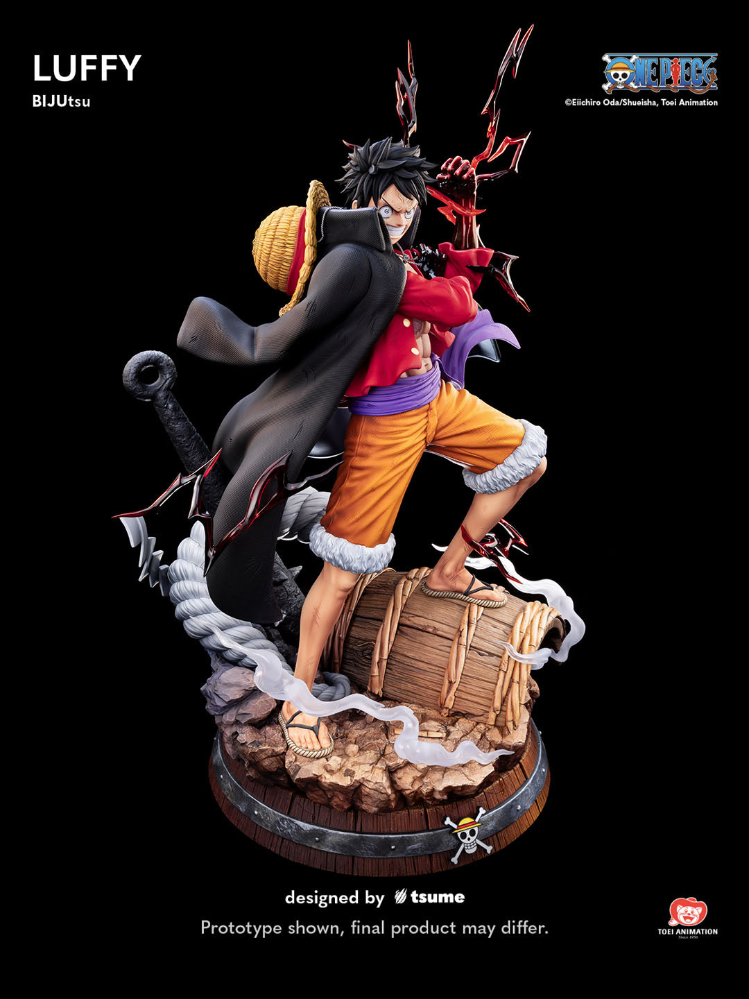 Tsume Art's third addition to their One Piece BIJUtsu line is noneother than the Straw Hat captain, Luffy. Inspired by the Onigashima arc, this piece features him posed victoriously after his battle with Kaido. Details throughout capture his strength and resolve, while the base refrences the aftermath of the fight. Included with this piece are alternate portraits and right arm switch-outs for multiple display options.