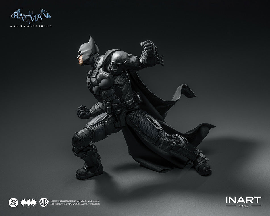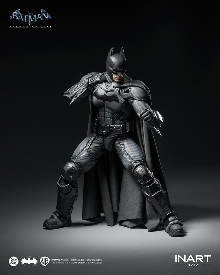 Queen Studios' InArt presents their Batman 1/12 Scale Figure, from Batman: Arkham Origins. Based on his early Dark Knight appearance, this piece includes two head sculpts, a wired fabric cape, and integrated articulation. Also included ten hand switch-outs and tools such as: the Batclaw, Batarang, and Explosive Gel Gun.