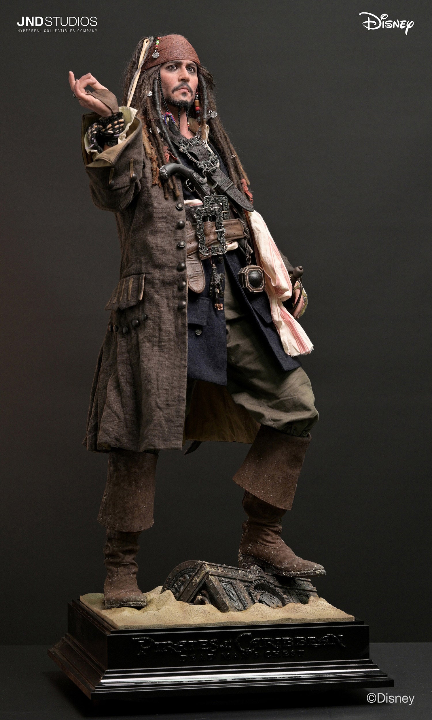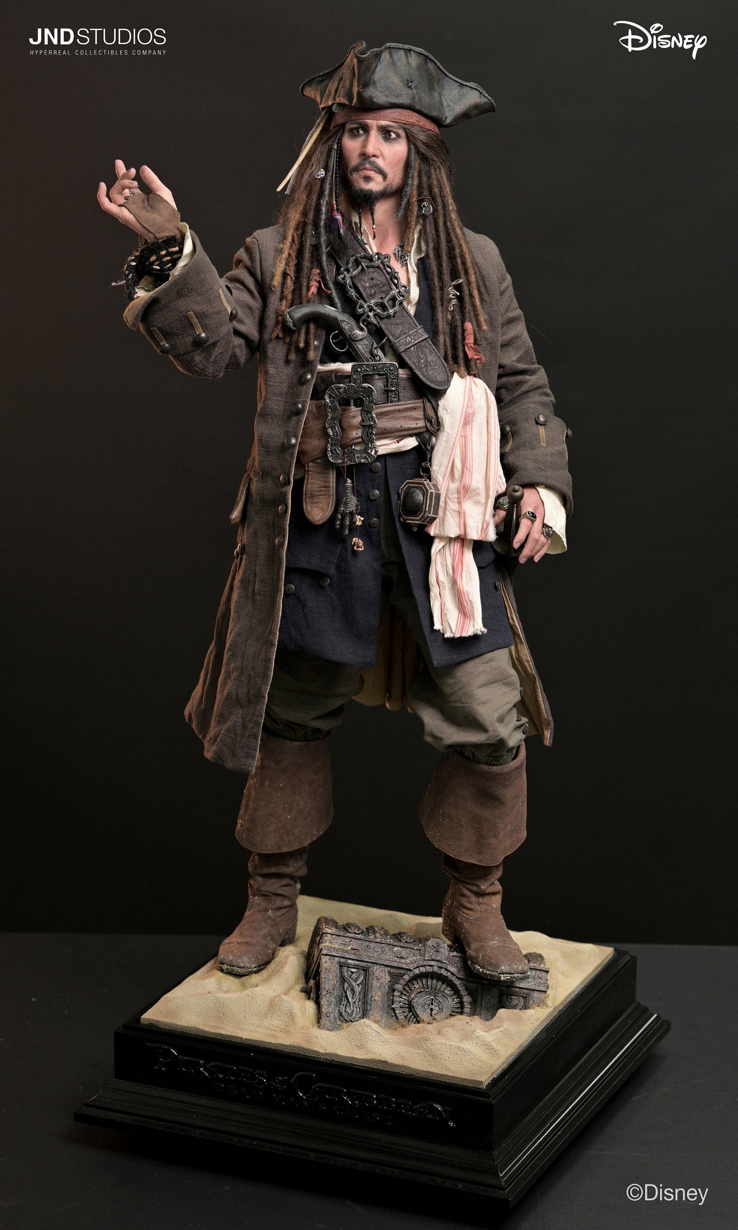 JND Studios presents their first Pirates of the Caribbean collectible, the Jack Sparrow 1/3 Scale Statue. Featuring Johnny Depp's likeness, this piece boasts of a silicone head with rooted hair, glass eyes, and detailed accessories. With layered costume, included are his weapons, compass, and a character-themed base to complete the display.