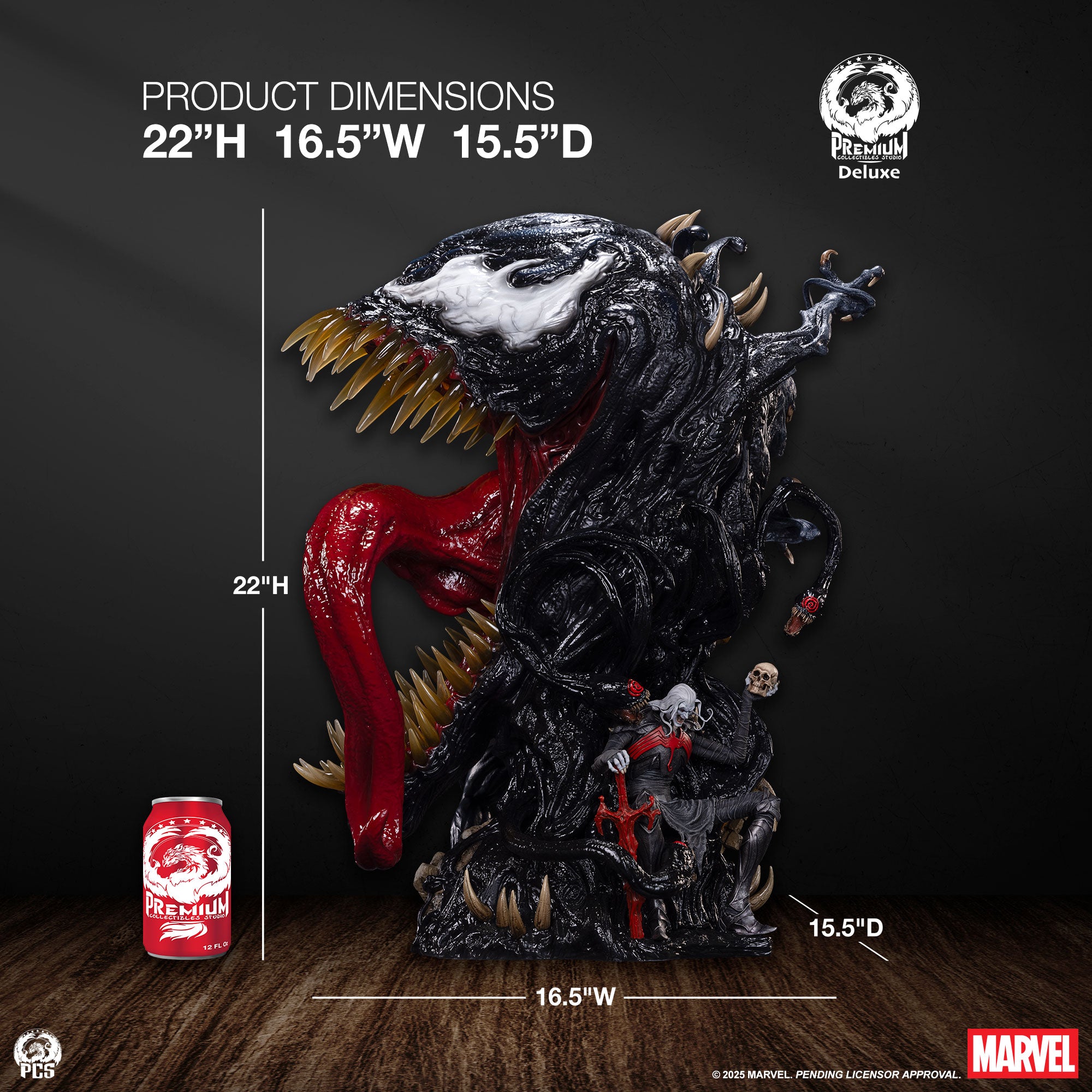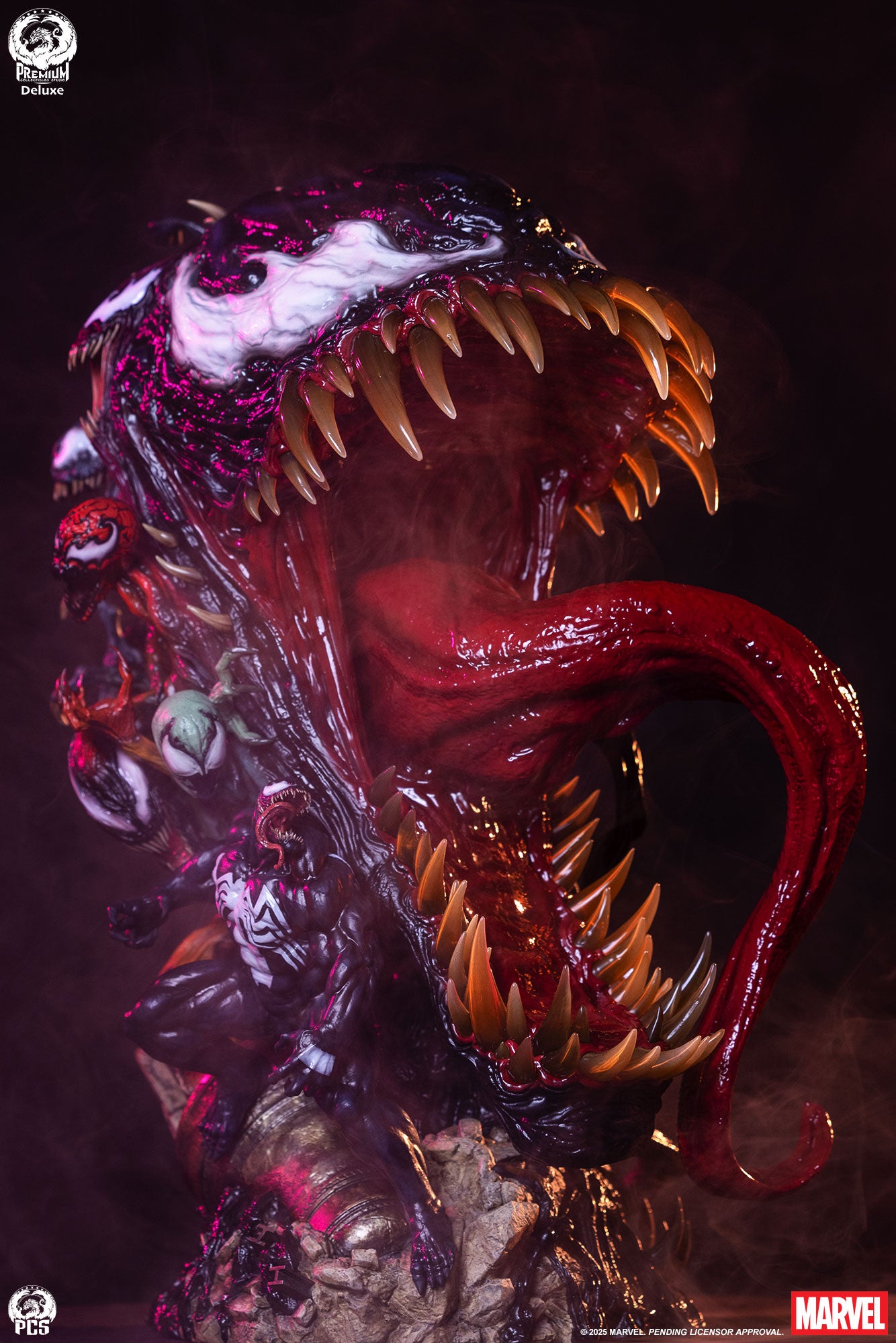Premium Collectibles Studio adds to their Fine Art Bust collection with Venom (Deluxe). Standing about 22 inches tall, this piece centers on Venom’s frightening presence with rows of sharp teeth and a coiled red tongue. Surrounding him are: Carnage, Lasher, Scream, Phage, Riot, and Agony. For the Deluxe Edition, Knull is seated among his symbiotic horde.