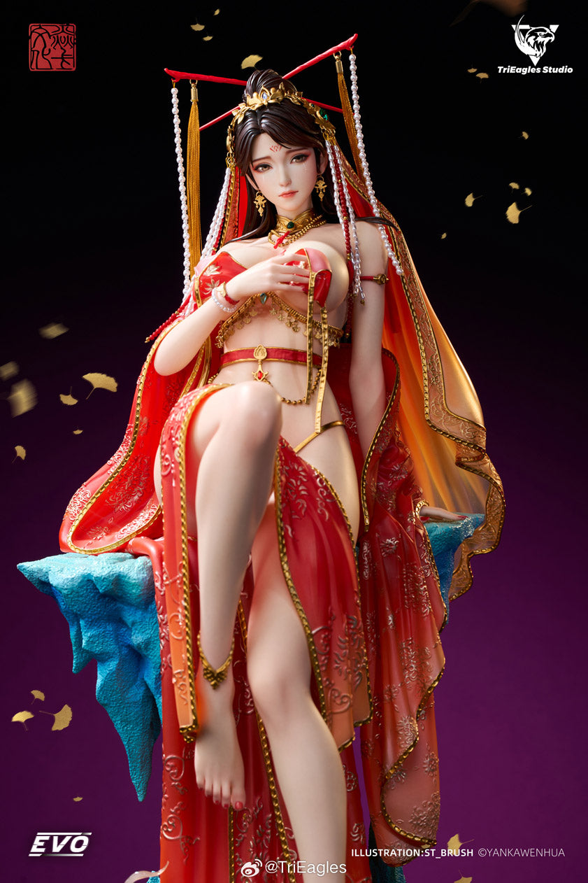 TriEagles Studio presents the latest piece in their Evolution Series, Nie Xianqian. Inspired by a short story featured in Strange Stories from a Chinese Studio, its main ghost protagonist is reimagined in statue form. Draped in warm colors with gold accents, some of the accessories feature zircon, faux pearls, and tassels. With an edition size of 299 pieces, this statue stands nearly 20 inches tall.