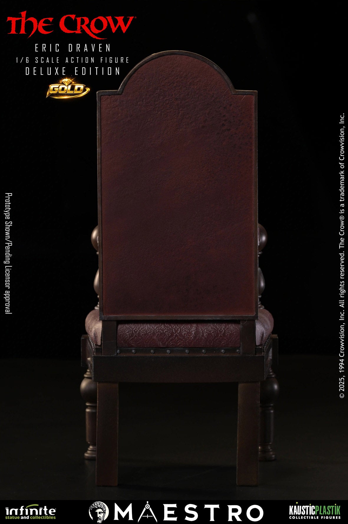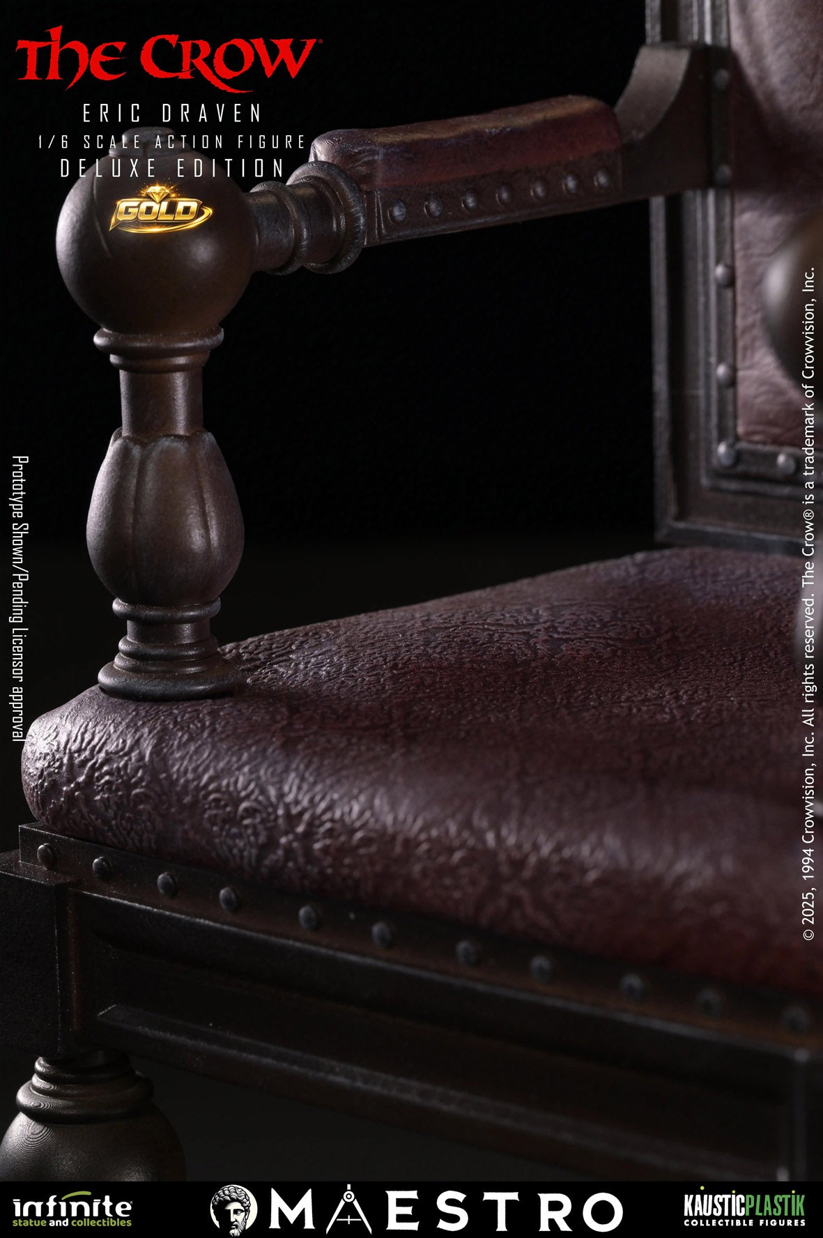Kaustic Plastik's intial entry in their Maestro Line is their Eric Draven (Deluxe Edition Gold) 1/6 Scale Figure. Based on the film version of the character, Brandon Lee's likeness is captured with realism, accompanied by rooted hair made of wool. Made from real leather, the clothing demonstrates natural texture and wear.