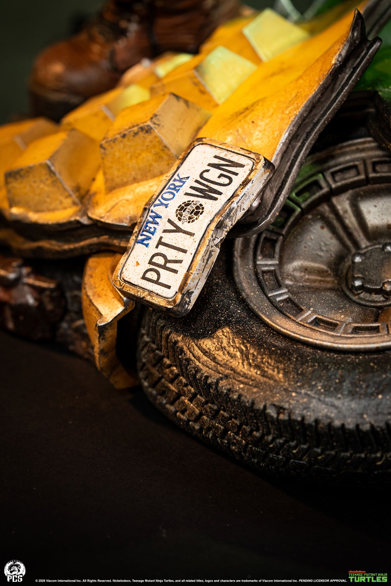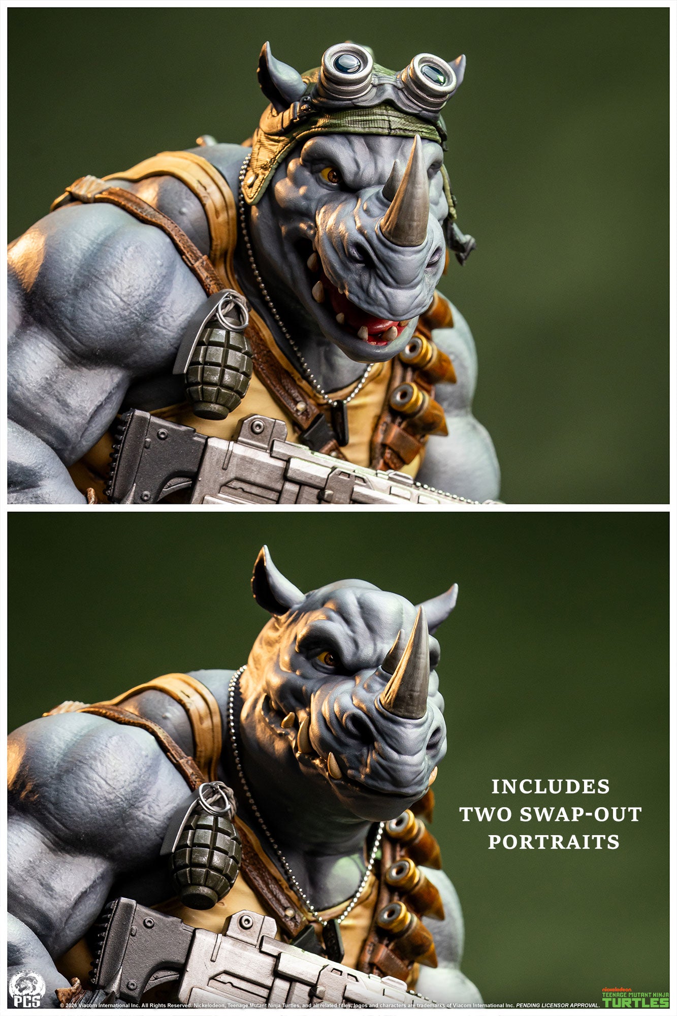 Premium Collectibles Studio presents their latest TMNT Legends statue, Rocksteady. Produced in 1/3 scale, this piece measures about 27 inches tall. Posed atop Party Wagon wreckage, he holds his heavy blaster. Accessories with this piece are: grenades, a turtle shell knee pad, a back-mounted knife, and a loaded bandolier. Also included is an alternate portrait without cap and goggles.