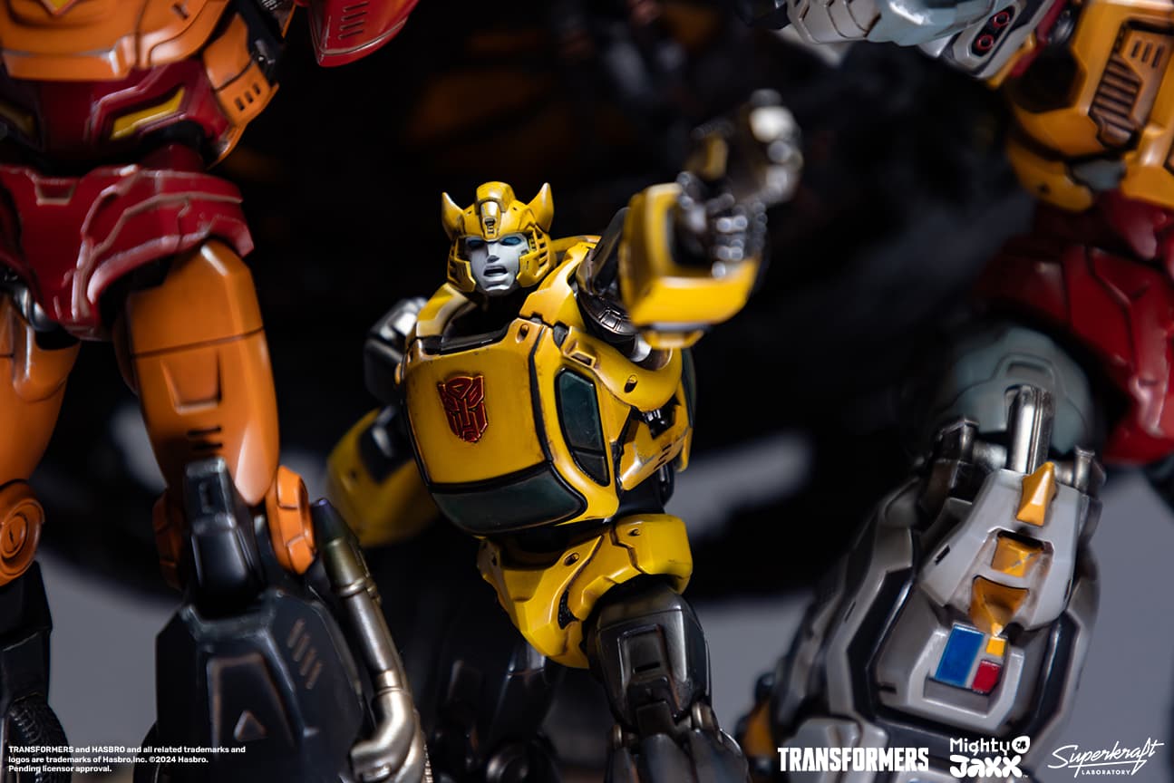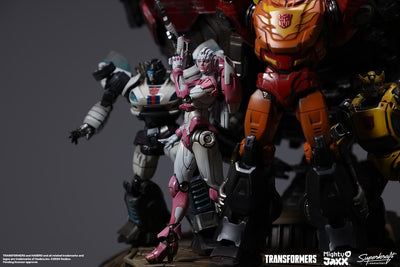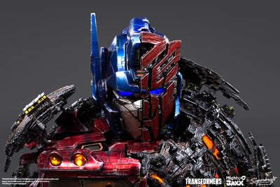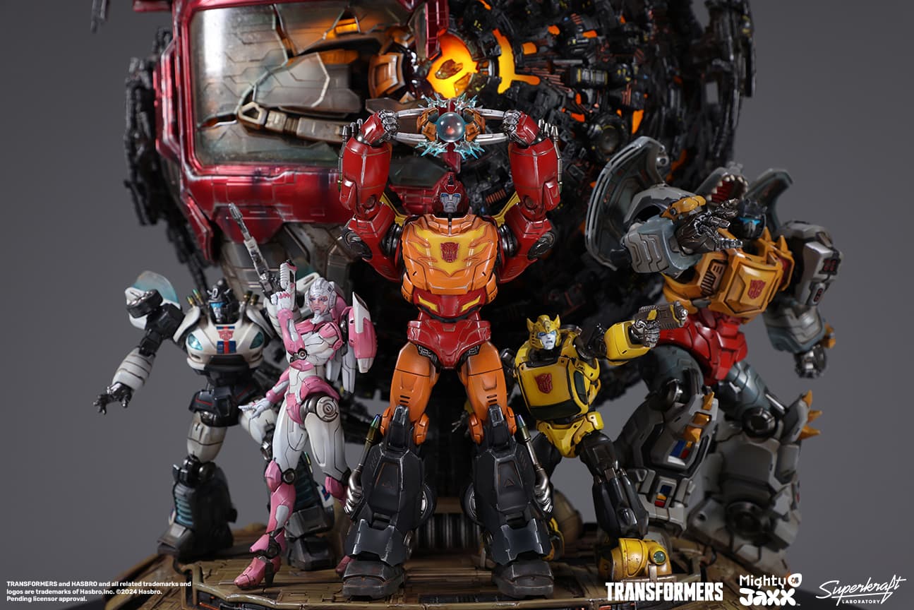 Superkraft Lab presents the first in their Transformers line: a G1 movie-inspired diorama. Optimus Prime transforms into the Autobot logo, symbolizing leadership, with Cybertron's skyscrapers behind him. Below, Rodimus lifts the Matrix of Leadership, joined by five Autobots. The base features the Ark, while the back reveals Cybertron’s core with Vector Sigma. LED lighting enhances the eyes, Matrix, and Cybertron.